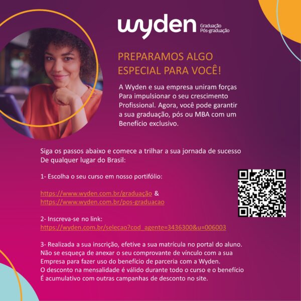 Lembramos que o convênio empresa oferece um processo simplificado e eficiente para garantir que você possa aproveitar os benefícios educacionais da Wyden com facilidade. O desconto empresa é acumulativo com demais descontos de campanha. Se tiver alguma dúvida ou precisar de mais informações, não hesite em entrar em contato com nossos consultores.