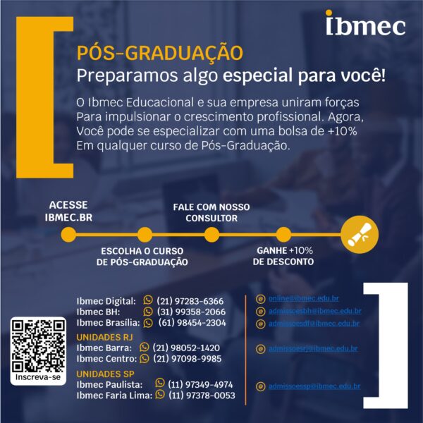 Lembramos que o convênio empresa oferece um processo simplificado e eficiente para garantir que você possa aproveitar os benefícios educacionais do Ibmec com facilidade. O desconto empresa é acumulativo com demais descontos de campanha. Se tiver alguma dúvida ou precisar de mais informações, não hesite em entrar em contato com nossos consultores.